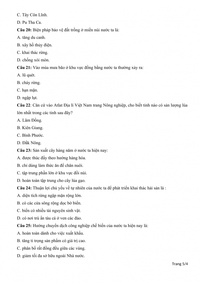 Câu 13: Căn cứ vào Atlat Địa lí Việt Nam trang Giao thông, cho biết đường số 25 đi qua địa điểm nào sau đây?