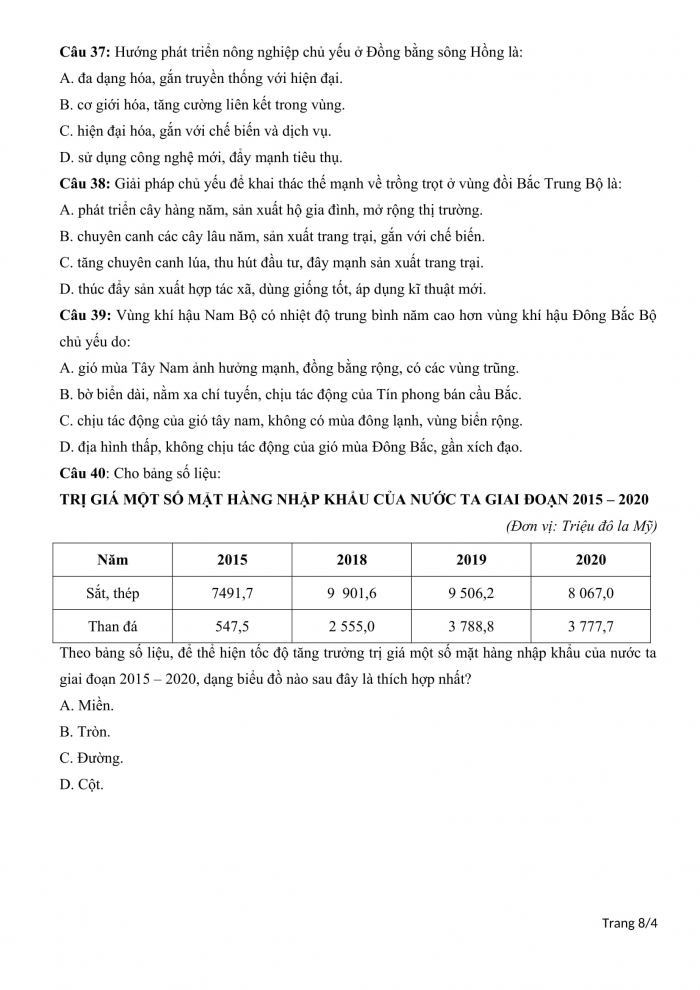 Câu 38: Giải pháp chủ yếu để khai thác thế mạnh về trồng trọt ở vùng đồi Bắc Trung Bộ là: