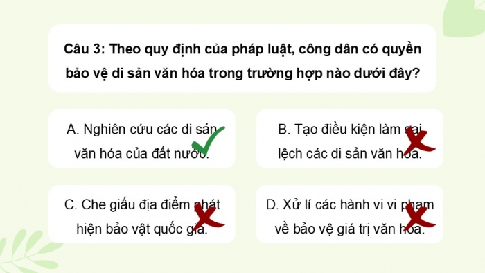 Câu 3: Theo quy định của pháp luật, công dân có quyền bảo vệ di sản văn hóa trong trường hợp nào dưới đây?
