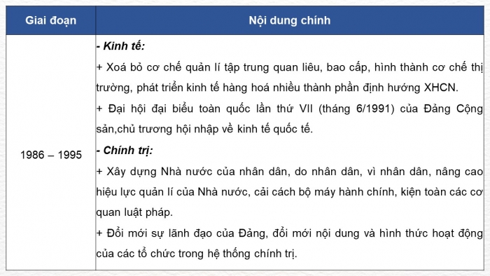 | 1986 – 1995 | - Kinh tế: + Xoá bỏ cơ chế quản lí tập trung quan liêu, bao cấp, hình thành cơ chế thị trường, phát triển kinh tế hàng hoá nhiều thành phần định hướng XHCN. + Đại hội đại biểu toàn quốc lần thứ VII (tháng 6/1991) của Đảng Cộng sản,chủ trương hội nhập về kinh tế quốc tế. - Chính trị: + Xây dựng Nhà nước của nhân dân, do nhân dân, vì nhân dân, nâng cao hiệu lực quản lí của Nhà nước, cải cách bộ máy hành chính, kiện toàn các cơ quan luật pháp. + Đổi mới sự lãnh đạo của Đảng, đổi mới nội dung và hình thức hoạt động của các tổ chức trong hệ thống chính trị. |