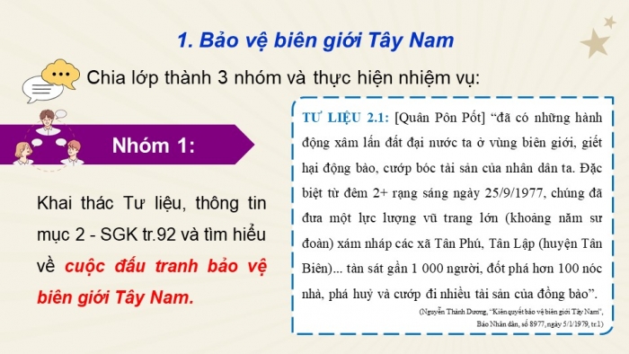Khai thác Tư liệu, thông tin mục 2 - SGK tr.92 và tìm hiểu về cuộc đấu tranh bảo vệ biên giới Tây Nam.