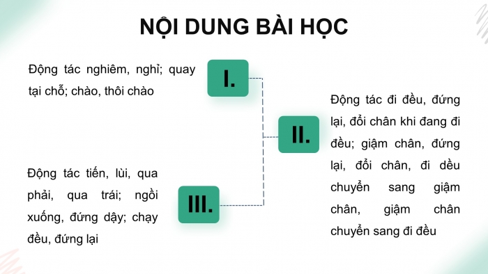 ĐỘNG TÁC TIẾN, LÙI, QUA PHẢI, QUA TRÁI; NGỒI XUỐNG, ĐỨNG DẬY; CHẠY ĐỀU, ĐỨNG LẠI