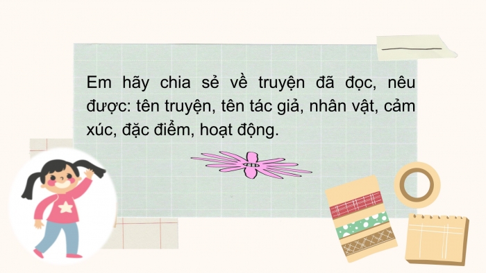 Em hãy chia sẻ về truyện đã đọc, nêu được: tên truyện, tên tác giả, nhân vật, cảm xúc, đặc điểm, hoạt động.