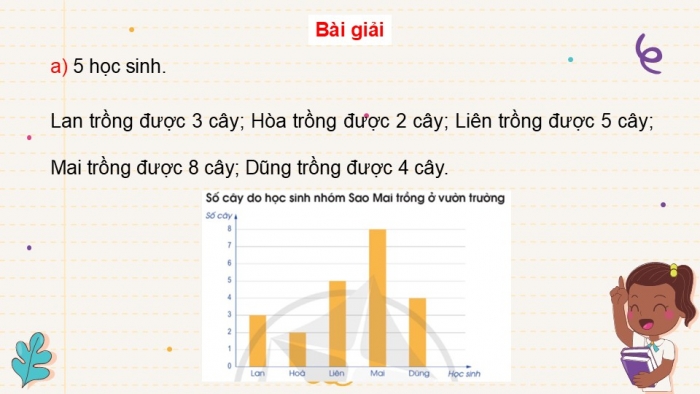 Để biểu thị số cây do từng học sinh trong nhóm Sao Mai trồng ở vườn trường người ta đã dùng biểu đồ dưới đây: