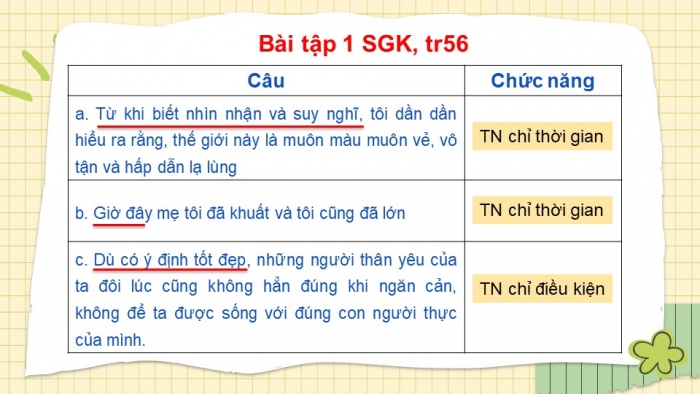 - GV yêu cầu HS trả lời câu hỏi: Quan sát các câu sau và chỉ rõ vị trí, chức năng của thành phần trạng ngữ trong các câu sau: