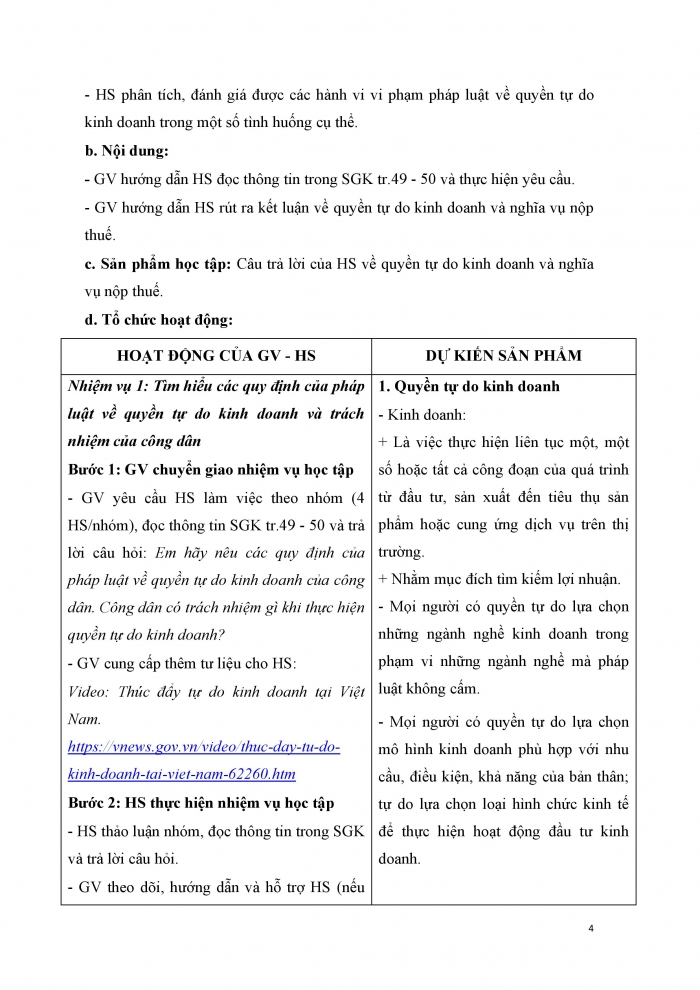 HS thảo luận trả lời câu hỏi: Em hãy nêu các quy định của pháp luật về quyền tự do kinh doanh của công dân. Công dân có trách nhiệm gì khi thực hiện quyền tự do kinh doanh?