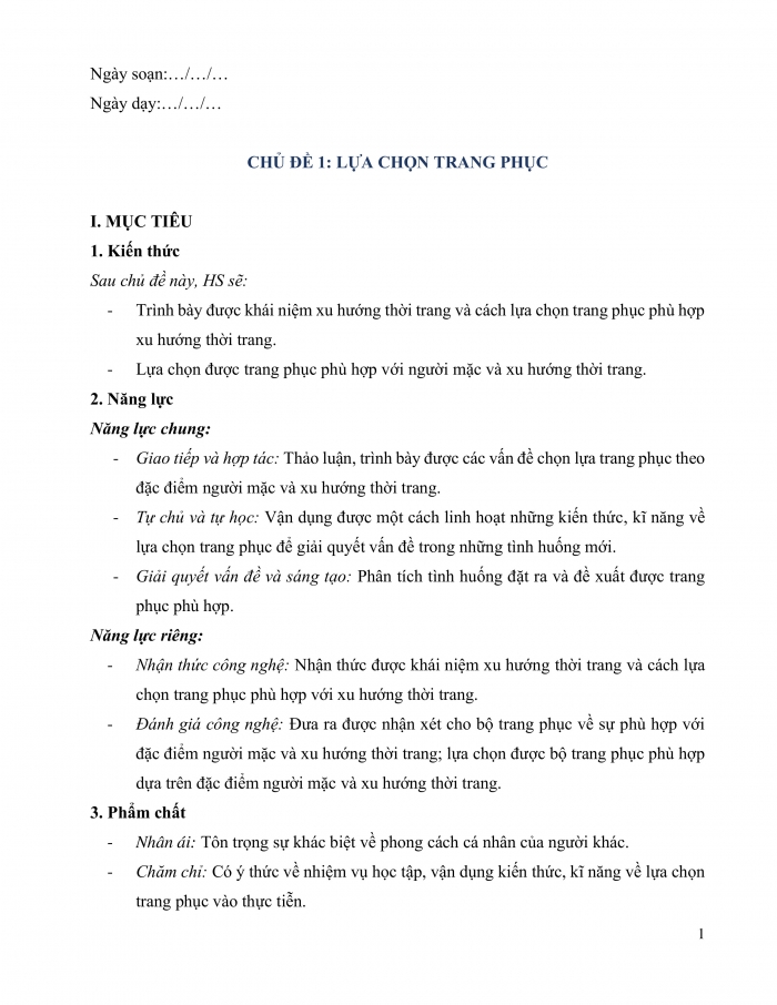 Giáo án và PPT công nghệ 9 cắt may Chân trời chủ đề 1: Lựa chọn trang phục