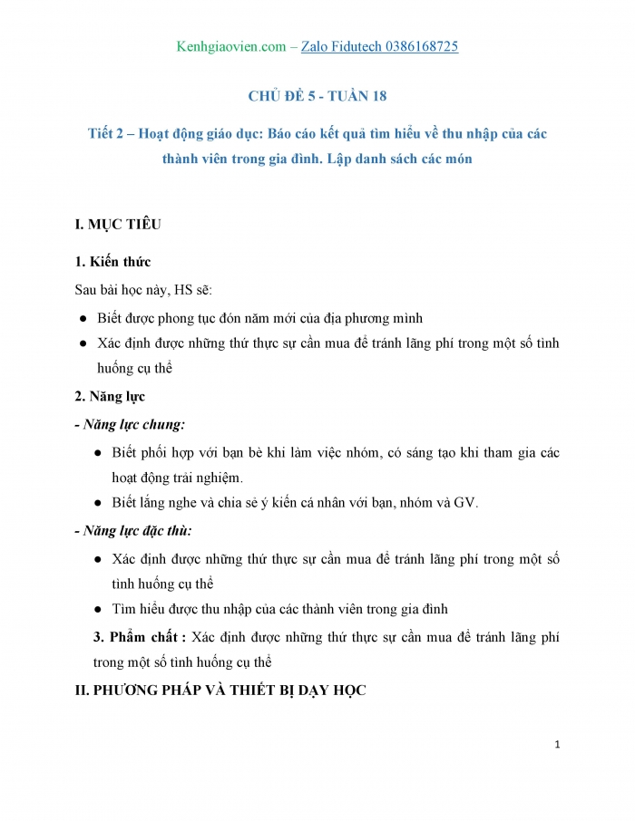Hoạt động giáo dục: Báo cáo kết quả tìm hiểu về thu thập của các thành viên trong gia đình. Lập danh sách các món hàng cần mua để đón năm mới. Sắm vai xử lí tình huống
