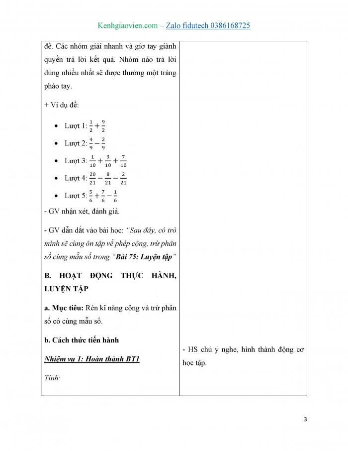 - GV dẫn dắt và đặt vấn đề: Vậy là ta đã biết cách tính phép tính cộng các phân số. Cô trò mình cùng đi tìm hiểu bài học ngày hôm nay"