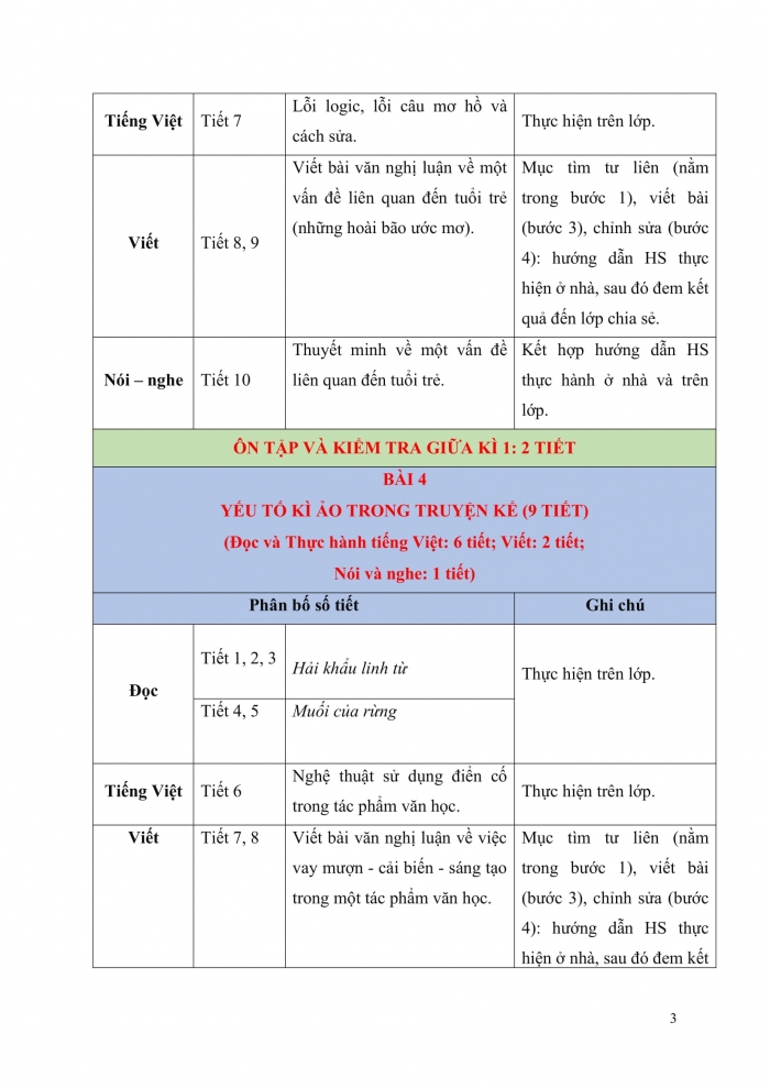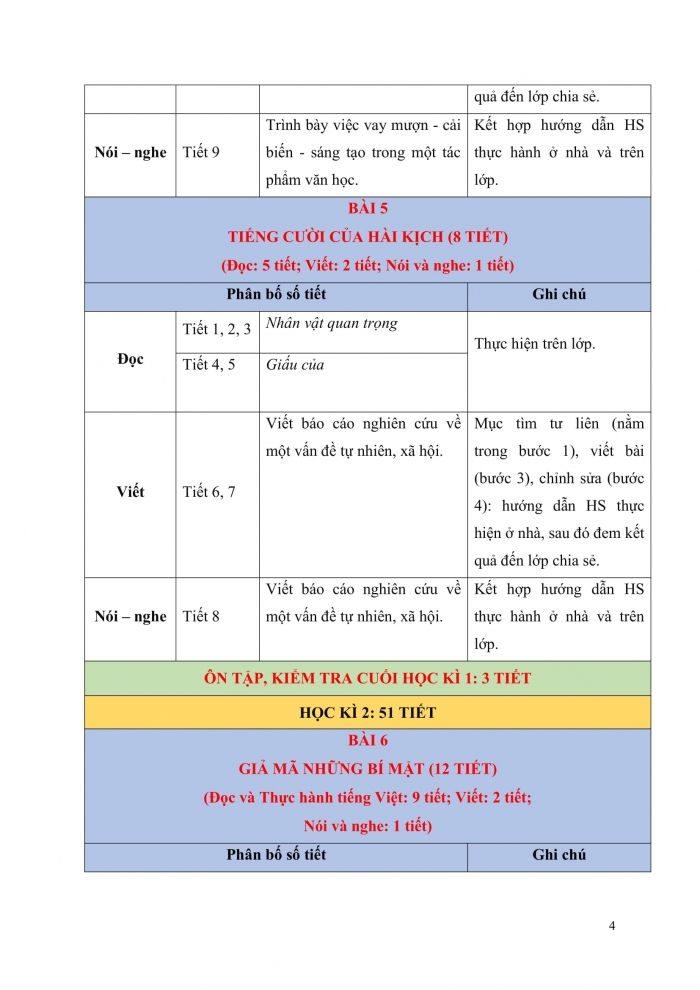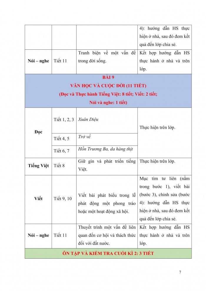 Nói – nghe | Tiết 9 | Trình bày việc vay mượn - cải biến - sáng tạo trong một tác phẩm văn học. | Kết hợp hướng dẫn HS thực hành ở nhà và trên lớp. |