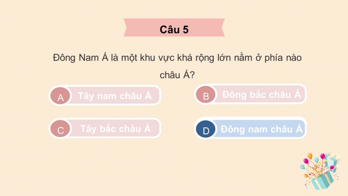 Luật chơi: Có 5 hộp quà, nếu em trả lời đúng câu hỏi, em sẽ được mở hộp và nhận quà. Nếu trả lời sai em sẽ không được nhận quà. Bạn khác sẽ được giành quyền trả lời và nhận quà.