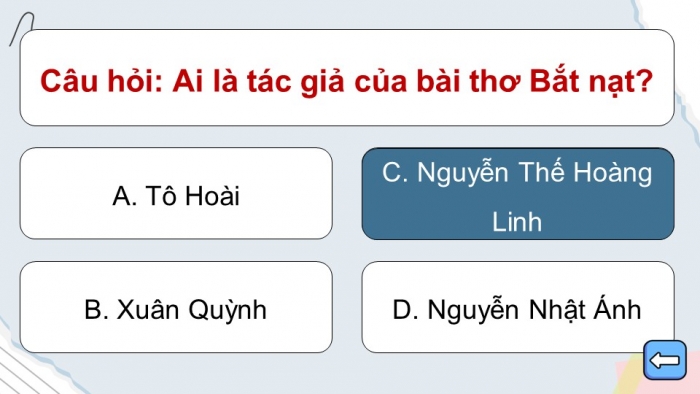 Luật chơi: Trò chơi gồm các câu hỏi trắc nghiệm với 4 đáp án A, B, C, D. Học sinh lần lượt chọn một bông hoa bất kỳ để mở câu hỏi bên trong. Sau khi đọc kỹ, các em chọn đáp án đúng nhất.