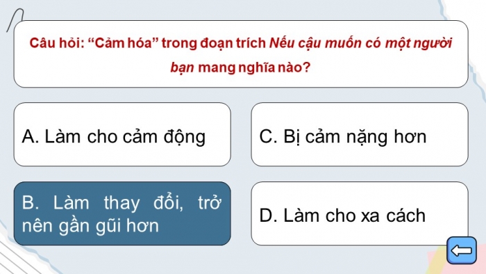 - Hiểu được ý nghĩa của cụm từ “Cảm hóa”, từ đó gợi ra cách kết bạn cho học sinh.